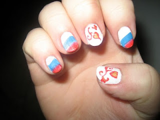 What a joy is the Olympics, i only wish i had more time right now to watch it. I am so proud of Russian athletes, and for Americans as well. Right now Russia is on 4th place of the overall medals count, with the total of 11 medals. The red thing on my nails represents an Element from Russian Olympics uniform.